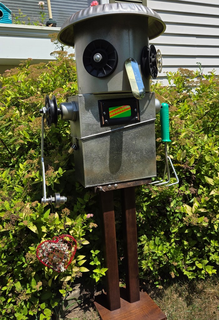 A new hanging robot went into Sawmill River Arts Gallery on Friday afternoon. His name is Shelburn, appropriate, I thought! He is named after his Shelburne Falls coffee tin that he proudly displays on his chest! He was not quiet done in this image as I needed to add the percolator basket to his head.